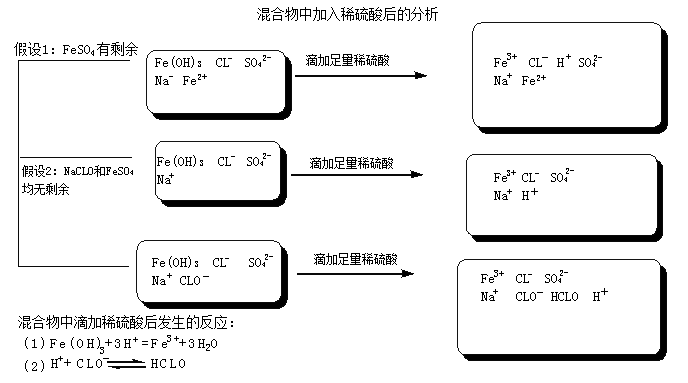(1)理清实验目的;(2)分析反应物的性质和对应反应的特征和原理,使得学生下次遇到类似的题,做到心中有数。郭老师为了让学生理解题意,将试题中抽象的文字:"将一定量NaClO溶液与FeSO4溶液相混合,得到含有大量悬浮物的混合液"用实验现场演示,个别提问学生溶液中可能含有的物质,引导学生学会用分子、离子的视角思考问题,抓住重点:让学生思考将一定量NaClO溶液与FeSO4溶液相混合后,分子、离子发生的变化以及可能发生的反应,分析得到的含有大量悬浮物的混合液中可能含有的分子、离子。提出了让学生通过画反应流程图的策略。按照如下的思路分析问题:
